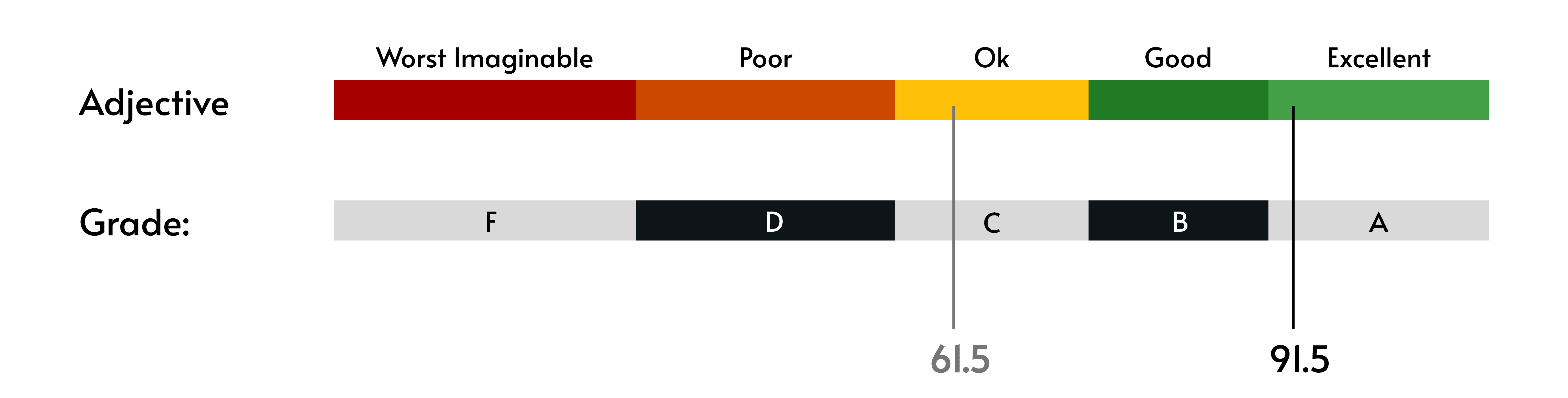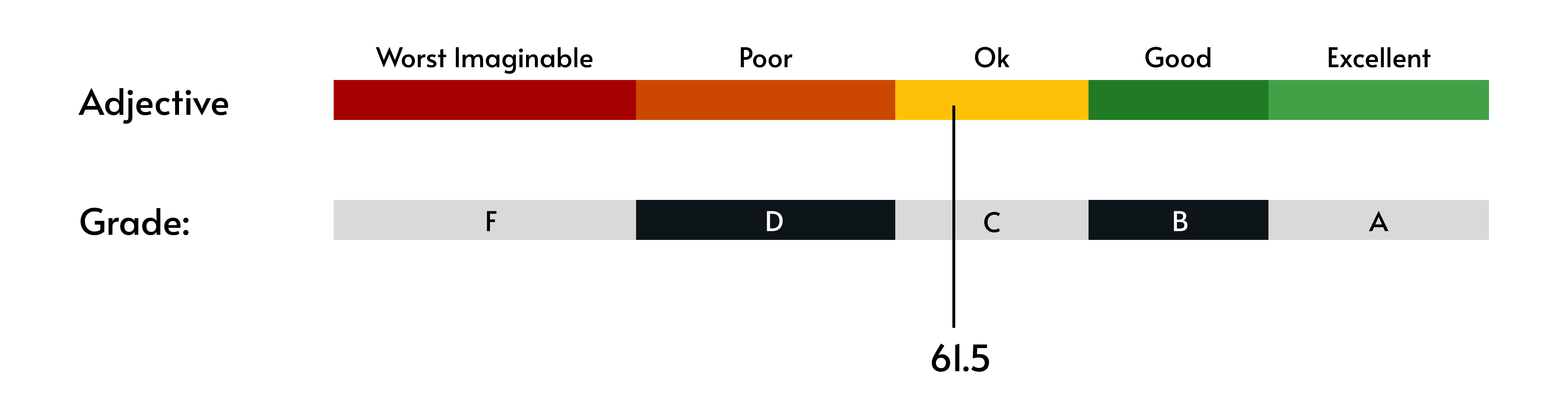 The average SUS rating for the website from the users was a 61.5, which has the Qualitative label of “Ok”, and the grade level of “D”.