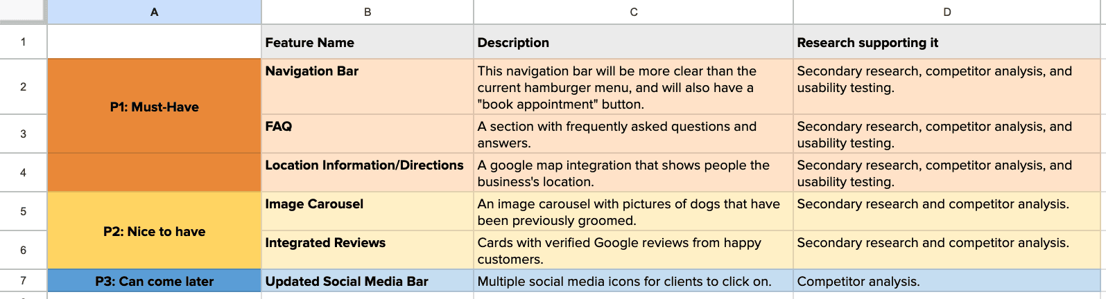I researched three popular grooming websites and noted what they did/didn’t do: 1) Barkbus, 2) Petco, and 3) Dashing Dog Grooming. I compared their mission statements, their target markets, their strengths, and their weaknesses. I also was careful to pay attention to if there were any features that were common among competitors that were absent on my client’s site, or vice versa.